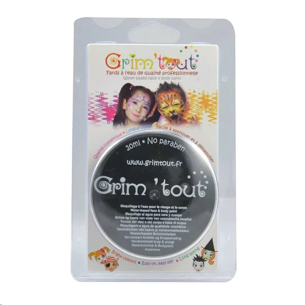 GRIM’TOUT est un maquillage non gras à l’eau de qualité spécialement conçu pour convenir aux peaux délicates des enfants. Toujours dilué à l’eau, il s’applique simplement à l’aide d’une éponge ou d’un pinceau ! Démaquillage aisé à l’eau et au savon. Qualité professionnelle et conformité aux normes cosmétiques. Le galet de 20ml est idéal pour maquiller rapidement les enfants.