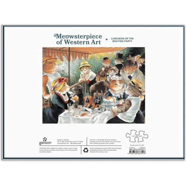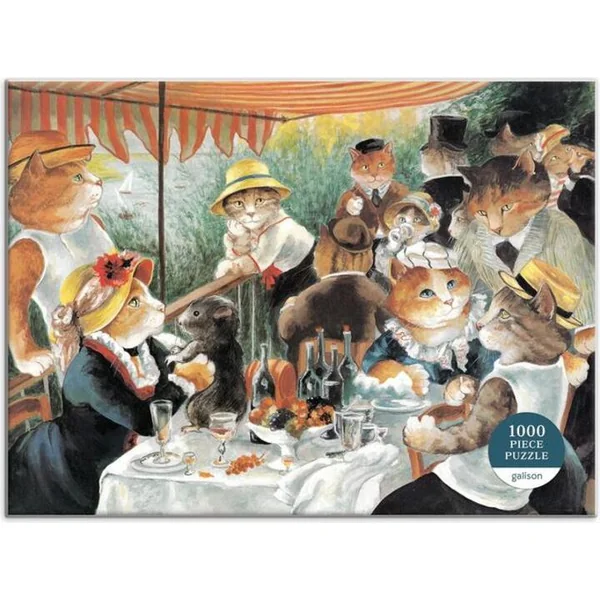 Le puzzle est une parodie drôle et affectueuse de l’œuvre emblématique de Renoir, Le Déjeuner des canotiers, par l’artiste félin Susan Herbert ! Les puzzles sont emballés dans des boîtes solides avec une finition mate.