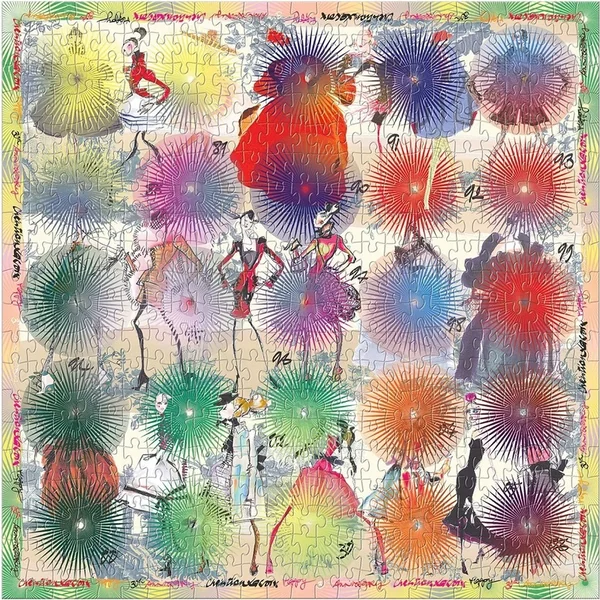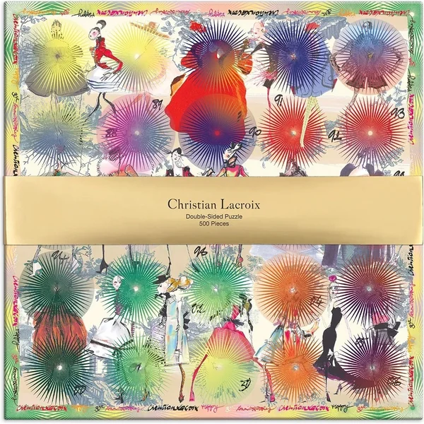Le puzzle Photocall à 500 pièces réversible comprend des croquis de mode haute couture et des explosions d’étoiles d’un côté du puzzle et un design floral illustré en noir et blanc de l’autre côté. Le design de Christian Lacroix célèbre le patrimoine culturel français et est vraiment unique. Le puzzle est emballé dans une boîte brillante originale avec une image de référence.