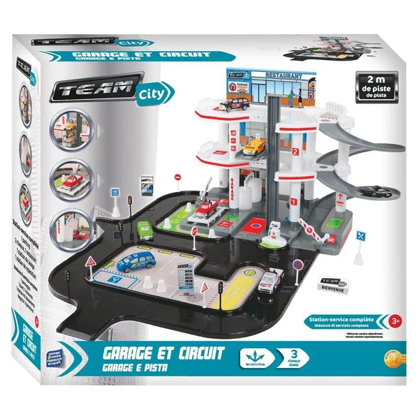 Garage trois niveaux à assembler avec deux mètres de piste et une station-service complète : un parking trois niveaux, un restaurant, une station de lavage et un atelier de réparation. De nombreux accessoires complètent le set dont des panneaux de signalisation, un ascenseur et des autocollants. En plastique. Véhicules non inclus. Instructions de montage imprimées sur la boîte.