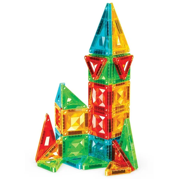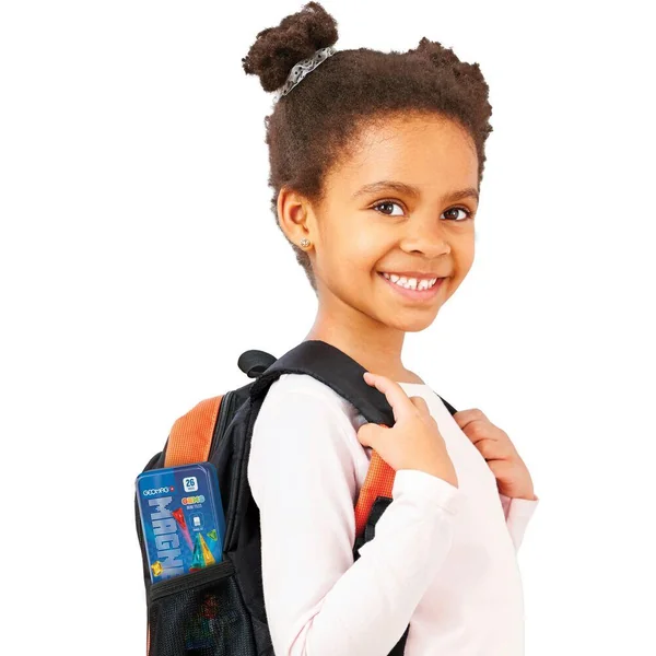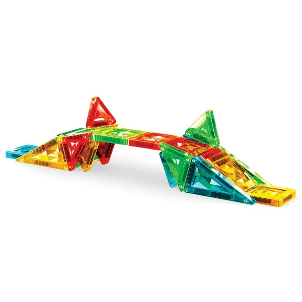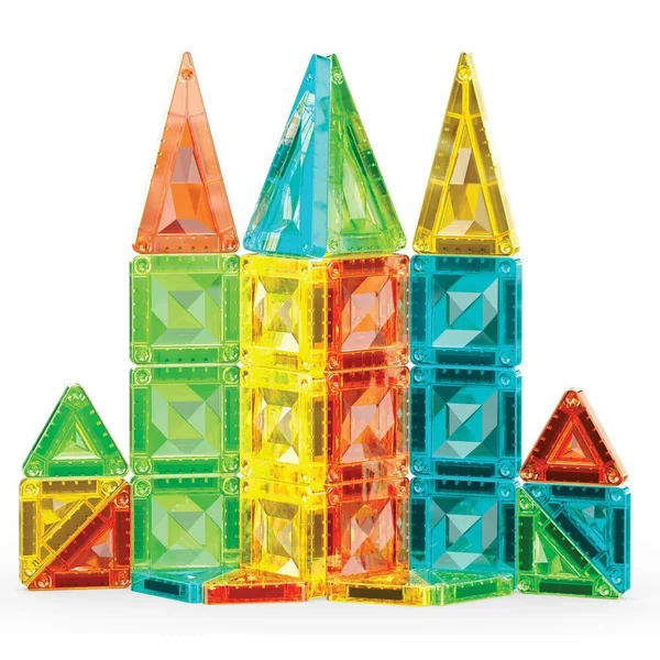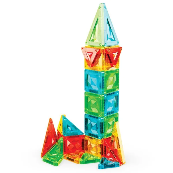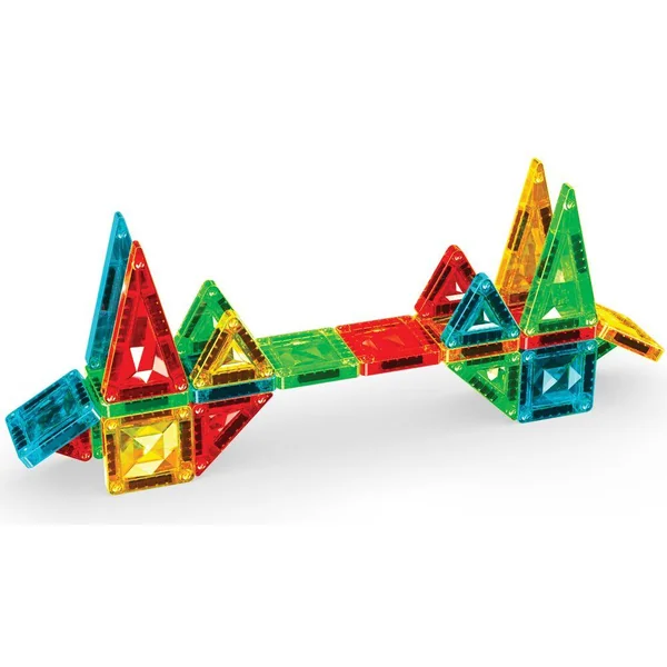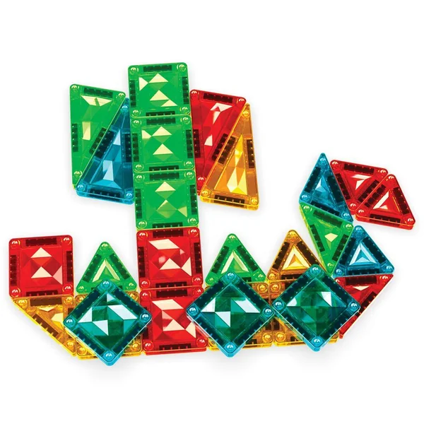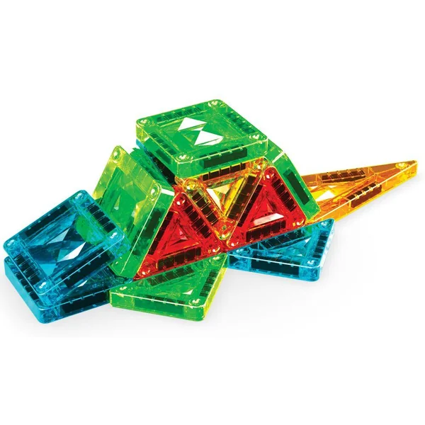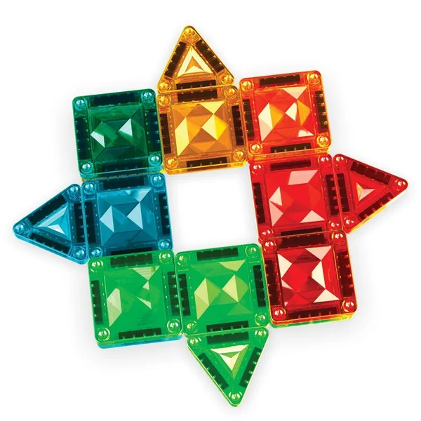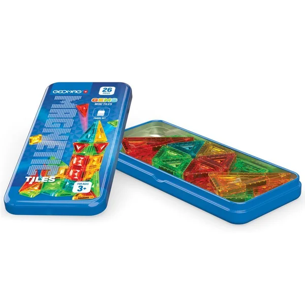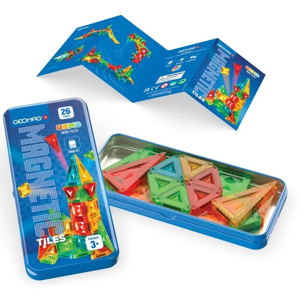 Le coffret 4106 comprend 26 mini-tuiles magnétiques de 4 formes différentes : carré, triangle équilatéral, triangle isocèle et triangle rectangle. Les tuiles sont disponibles en 4 couleurs transparentes Gems : vert, bleu, jaune et rouge. Le coffret est présenté dans une boîte en métal pratique, idéale pour les voyages. Entièrement compatible avec toutes les tuiles magnétiques.