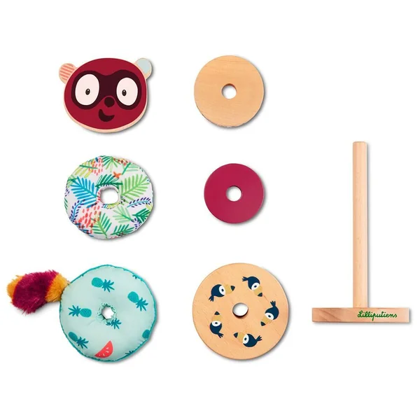 Jolie pyramide à empiler pour développer la motricité fine. Empilez les pièces de différents matériaux et de différentes couleurs de manière créative. La variété de formes, de couleur et de matériel stimulent les sens. (Lavable en machine). Avec des éléments en bois et en tissu de formes et couleurs différentes (bois certifié et peinture à l’eau).