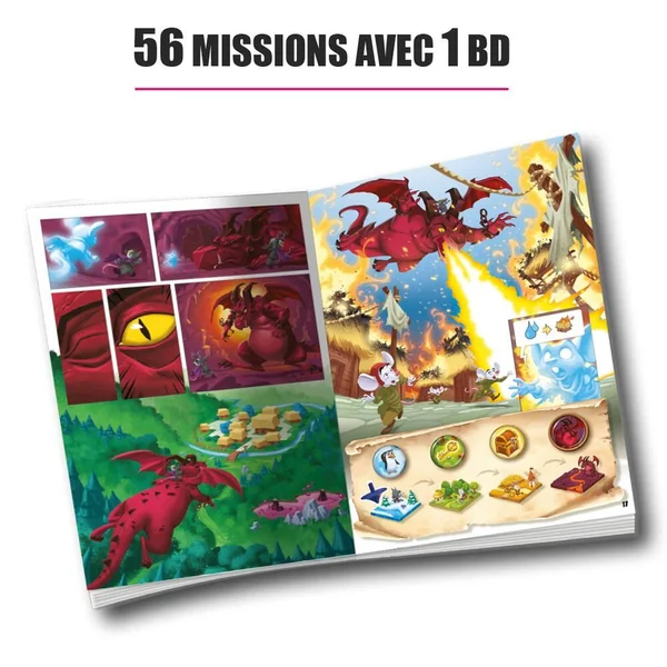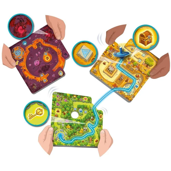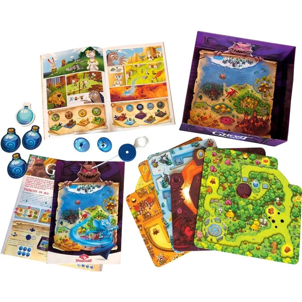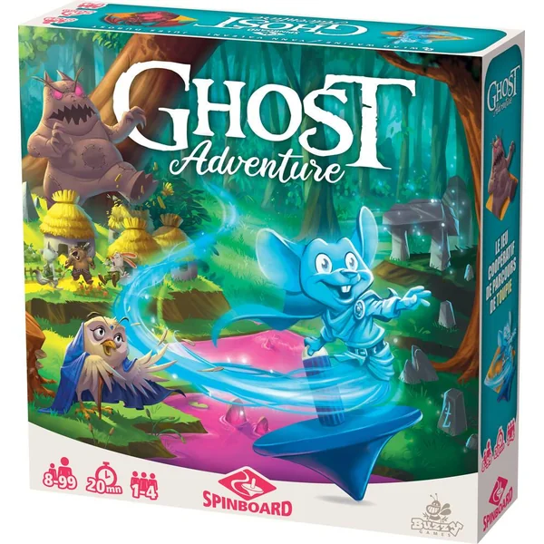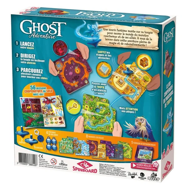 Les statues des Anciens ont toujours veillé sur le petit peuple celte. Jusqu’au jour où les guerriers-loups du Nord ont débarqué pour détruire ces totems magiques et capturer les esprits qui les habitent. Seule rescapée, une petite souris fantôme monte sur sa toupie pour sauver le monde du monstre cauchemar et de ses alliés. A vous de la lancer dans cette aventure pleine de magie et de rebondissements ! » Ghost Adventure est un jeu d’adresse coopératif où les joueurs vont devoir guider la toupie à travers les différents mondes afin de récupérer les objets nécessaires à leurs missions. Passage de plateau en plateau, escalade des différents niveaux d’un même plateau, saut d’un plateau à l’autre ou même d’un plateau à son verso, voici ce qui vous attend. Heureusement, des potions de relance vont permettre de relancer la toupie en cours de route, ouf ! Un jeu d’adresse innovant qui mettra en avant la coordination de l’équipe. Jouable aussi en mode Solo. Nombre de joueurs 1-4. Durée de la partie 1-4.