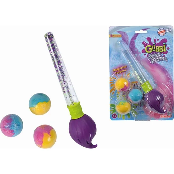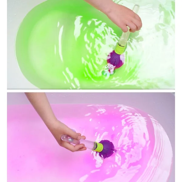 Pinceau magique pour le bain et 3 bombes effervescentes colorées dans l’emballage. Les boules effervescentes se mettent dans le pinceau et on peut ensuite peindre dans l’eau avec le pinceau.