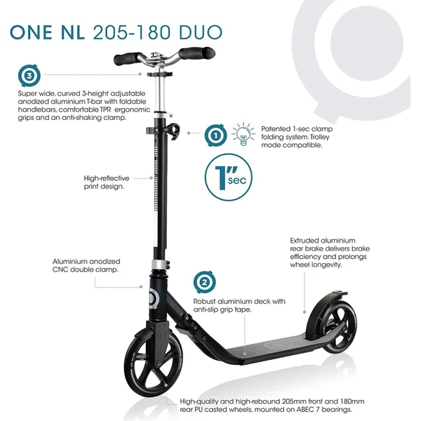 La trottinette ONE NL 200/180 fait partie des meilleurs modèles adaptés aux adultes. La trottinette a un corps solide et une capacité de charge de 100 kg. Elle se distingue par la technologie la plus moderne. Les roues sont équipées d’un moyeu ABEC 7 et le remplissage est un noyau « Bi-injection » breveté. Grâce à cette combinaison, la trottinette est extrêmement rapide, a une excellente inertie et, grâce à ses grandes roues, une excellente stabilité.