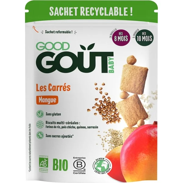 Ingrédients : 65 % de farine de riz bio, 10 % de farine de pois chiche bio, 7,5 % de lait entier en poudre bio LAIT, 6 % de poudre de mangue bio, 5 % de farine de quinoa bio, 5 % de farine de sarrasin bio, arôme naturel, vitamine B1. Sans gluten. Contient du lactose. Les allergènes sont indiqués en GRAND CARACTÈRE.
