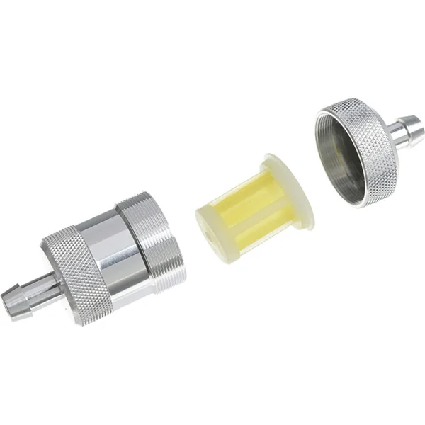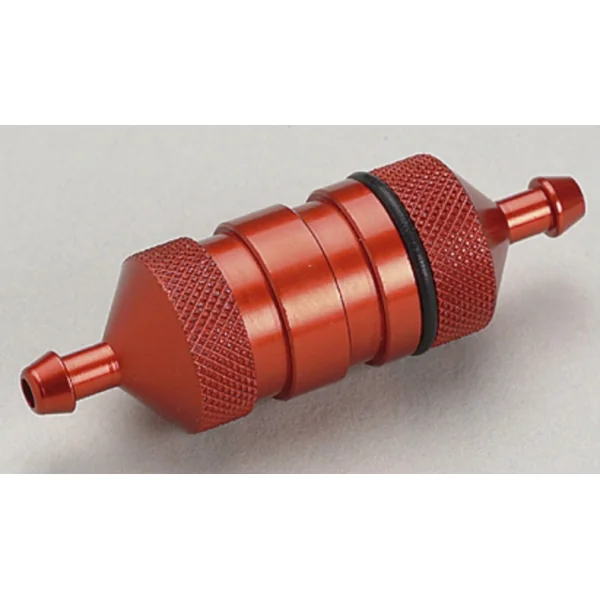 Filtre à carburant grand avec un tamis fin, en aluminium. Dimensions : longueur totale 40 mm, diamètre 19 mm, embout de tuyau 6/4,8 mm, longueur du corps du filtre environ 22 mm.