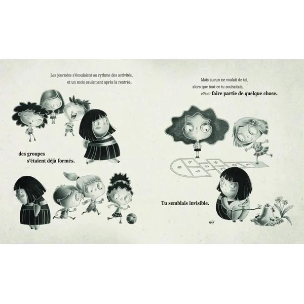 Les vacances d’été étaient passées en un clin d’œil. À l’école, un mois seulement après la rentrée, des groupes s’étaient déjà formés. Mais aucun ne voulait de toi : tu semblais invisible. Février fut le mois des premières moqueries. Une fille commença à se moquer de toi parce que tu étais un peu plus grande que les autres. Jour après jour, à chaque moquerie, à chaque méchanceté, à chaque exclusion, tu devenais plus malheureuse. C’était quelque chose qui grandissait en toi. Et toi, tu grandissais littéralement avec lui. Ta maman avait raison : tu allais devenir grande. Et tu l’es devenue pour de vrai.