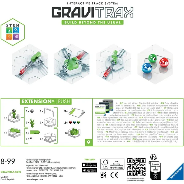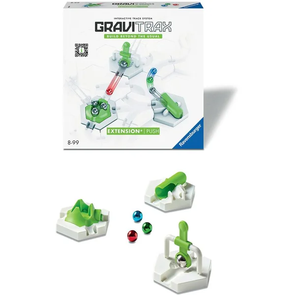 Un set unique rassemblant 3 éléments iconiques de la gamme GraviTrax : le Marteau, le Tiptube et le Volcan ; ainsi qu’une recharge de 3 billes incluse. Marteau : un bloc pour donner de l’élan aux billes et les aider à passer des obstacles. TipTube : un bloc innovant qui collecte jusque 3 billes, les retient puis les relâche toutes en même temps. Idéal pour créer des serpentins de billes et varier les rythmes ! Volcan : lorsque la bille frappe le bouton du volcan, le bloc entre en éruption et libère les 3 nouvelles billes qu’il contient dans 3 directions différentes. Ce set se joue avec au moins un Starter Set et peut ensuite se combiner avec tous les produits GraviTrax. Contenu : 1 Élément Marteau, 1 bloc d’action TipTube, 1 bloc d’action Volcan, 3 billes, 1 guide d’utilisation illustré.