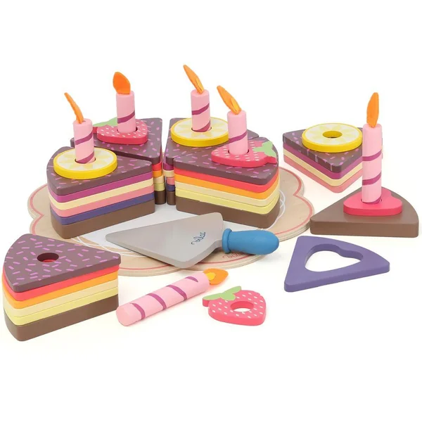 Composé de 56 pièces en bois, il permet aux enfants d’assembler, d’empiler et d’imaginer d’innombrables gâteaux colorés.