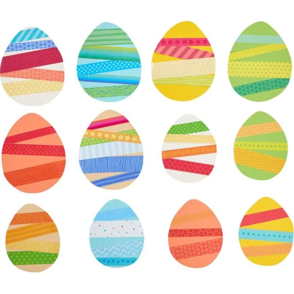 Il suffit de découper les œufs ainsi que les bandes décoratives, puis de les décorer de la manière la plus créative possible. Cela donne lieu à des œuvres d’art individuelles qui attirent magnifiquement l’attention sur chaque fenêtre ou buisson de Pâques.