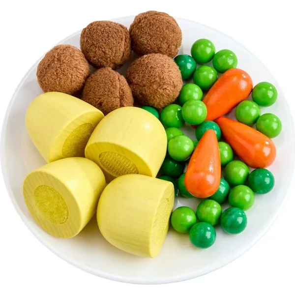 Ce set de 90 pièces avec des ingrédients en bois et en tissu invite les enfants à une aventure culinaire colorée.