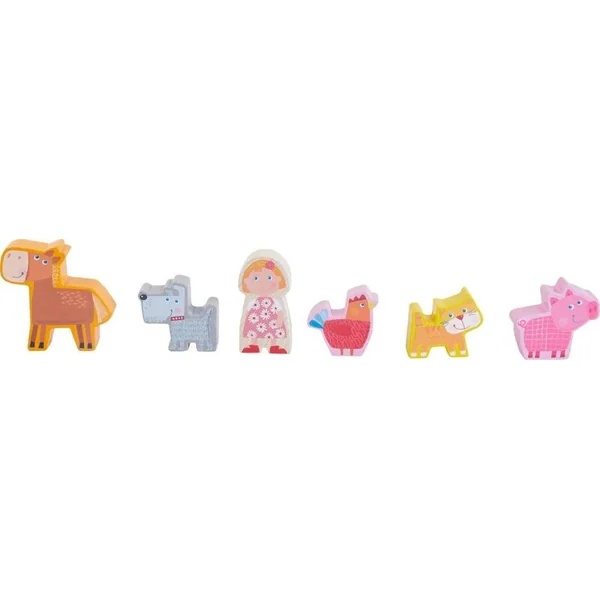 La ferme en bois à jouer comprend une fille et un garçon (figurine double face), ainsi qu’un chien, un chat, un cheval, un poulet et un cochon pour le jeu libre.