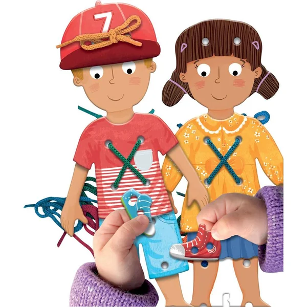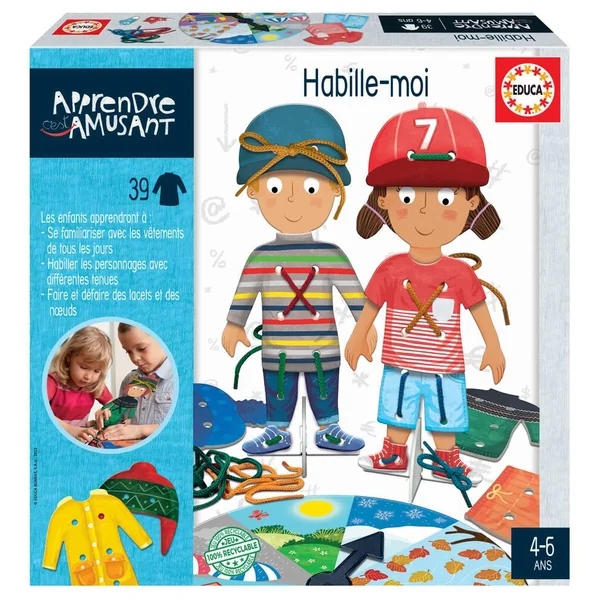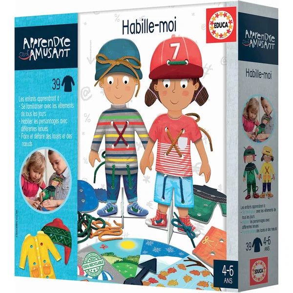 Apprends à t’habiller en mettant les vêtements que la roue a choisi aux personnages. 2 personnages, vêtements, 4 lacets pour attacher les vêtements et 1 roulette fournis.