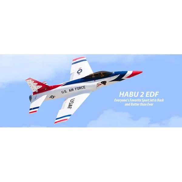Veuillez trouver notre toute dernière nouveauté de la gamme ParkZone, le HABU 2 BNF BASIC, après le succès du premier HABU ,voici le HABU 2, ce modèle possède une nouvelle aile qui offre la possibilité d’utiliser les volets pour des atterrissages et des décollages courts encore plus réalistes, de plus le HABU est décoré aux couleurs des THUNDERBIRDS de l’USAF. Ce modèle est livré préassemblé, avec 5 servos, le contrôleur, le récepteur, le moteur et la turbine déjà installés. Vous n’avez que l’émetteur, la batterie et son chargeur à ajouter.