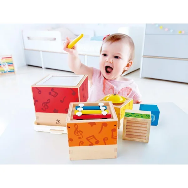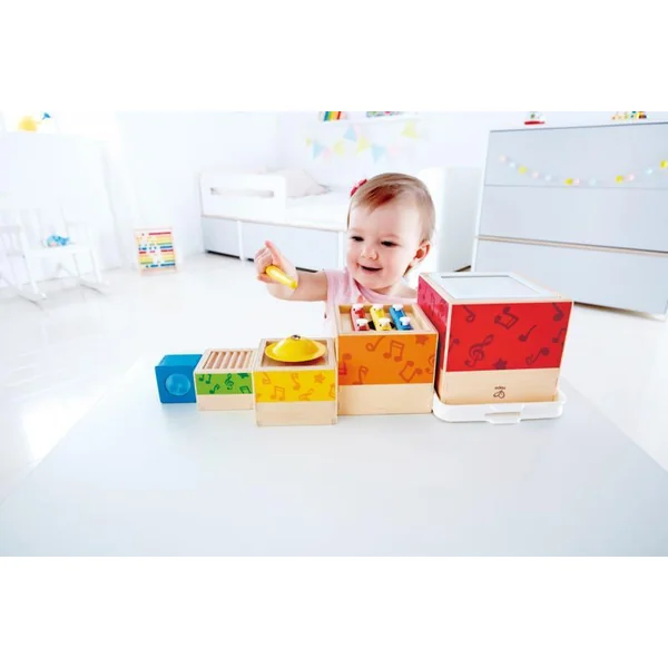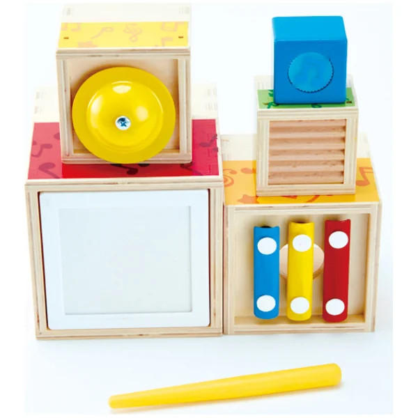 - Le set en bois comprend des blocs musicaux individuels avec différentes options de jeu, comme une cloche ou un mini xylophone.
