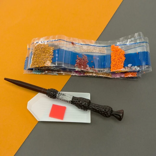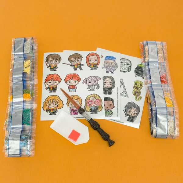 Autocollants à décorer avec des pierres précieuses colorées. Contient : trois planches 15x18cm de 9 stickers, 13 couleurs de gemmes, un stylo applicateur en forme de baguette de sureau avec de la cire, un plateau pour les gemmes. Les sujets des autocollants stylisent les icônes de la saga Harry Potter.