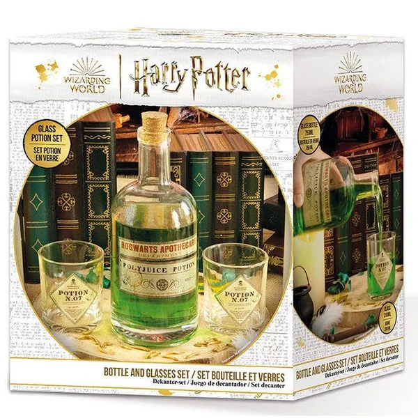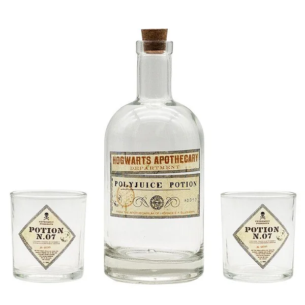 Polynectar, Potion N.07 ou juste une bonne limonade ? Préparez et savourez avec vos amis votre boisson favorite grâce à ce magnifique set bouteille et deux verres Harry Potter par ABYstyle. Mais attention, si vous vous trompez dans la préparation de votre potion, cela pourrait vous jouer des tours… Une limonade serait plus sûre après tout…