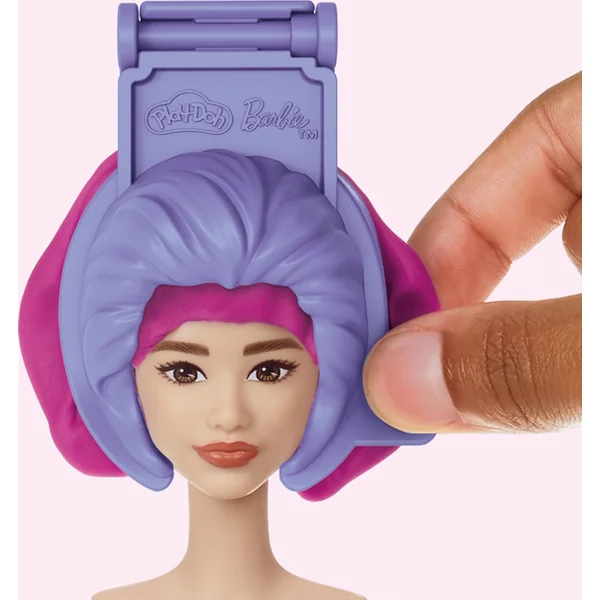 Il suffit de placer la poupée sur le support, d’utiliser le nuancier et les emporte-pièces Play-Doh pour découper des robes pour Barbie et de l’habiller de manière imaginative. Créez deux coiffures différentes pour la poupée avec Play-Doh à l’aide des emporte-pièces pour cheveux courts et longs ou créez vos propres coiffures à la main.