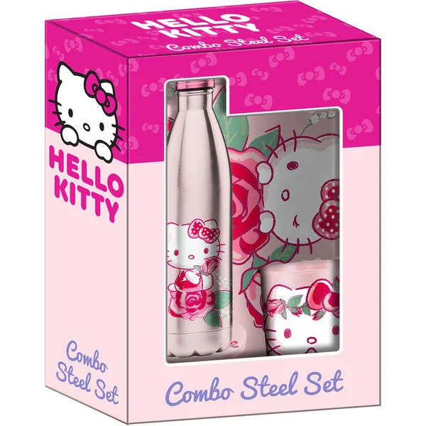 Coffret 100% Métal contenant une bouteille isotherme double paroi, pour maintenir le chaud comme le froid tout le long de la journée, un plateau multi-fonctions, un mug et une boîte à bonbons. Tous les objets de ce coffret sont aux couleurs de l’univers Hello Kitty