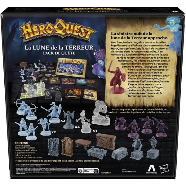 AGRANDIR SA COLLECTION DE FIGURINES : Cette extension de jeu de table inclut 29 figurines, comme des meubles, des guerriers elfes, des cultistes de la Terreur, des spectres, un esprit de la Terreur et plus encore – INCLUT 10 QUÊTES PASSIONNANTES : L’extension de jeu La lune de la Terreur inclut 10 quêtes, ainsi que des tuiles colorées et 58 cartes de jeu, le tout dans un monde elfique rempli de monstres, de pièges, de trésors et de sorts la lune de la Terreur – SE REJOUE À L’INFINI : Les joueurs plongent dans l’univers d’HeroQuest avec cette extension qui ajoute à la rejouabilité du jeu Les joueurs peuvent aussi créer leurs propres histoires et leurs propres quêtes –