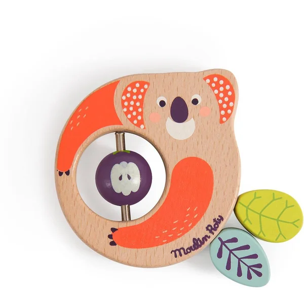 Hochet koala en bois avec, au centre, une perle fruit en bois le long d’une tige. Deux jolies feuilles verte et bleue viennent apporter une touche colorée à l’objet. Eveille l’intérêt de bébé et développe sa capacité à saisirun objet et à le manipuler.