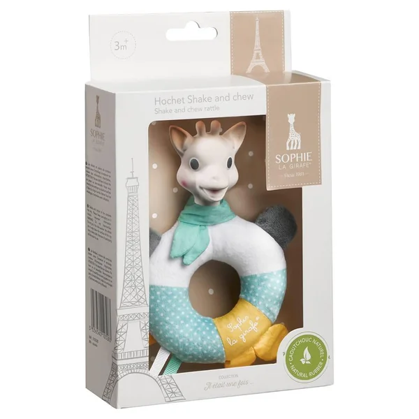 L’alliance entre le caoutchouc et le textile ! Un hochet 2 en 1 idéal pour apaiser et amuser bébé ! Grâce à ses différentes matières, le hochet Shake & chew offre 2 fonctions : – Anneau de dentition : la tête de Sophie la girafe en caoutchouc à mordiller pour apaiser les gencives douloureuses de bébé. – Hochet : des billes qui tintent à l’intérieur de l’anneau et du papier froissé à l’intérieur des feuilles éveillent l’ouïe de bébé. L’anneau tout doux facilite la préhension.