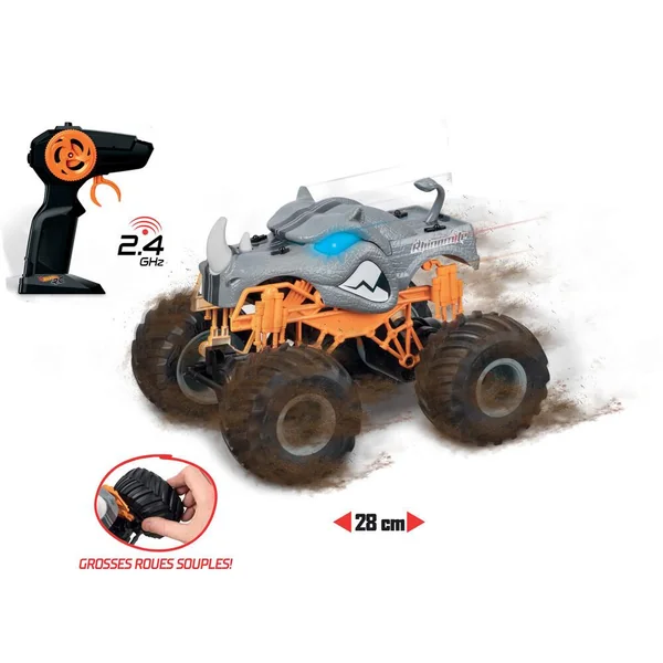 Monster Truck RC toutes directions. Fréquence 2,4GHz. Vitesse : 15 km/h. Portée maxi : 20-25 mètres. Pneus souples. Usage intérieur ou extérieur. Effets lumineux. Batterie amovible 7,4V Li-Ion 500mAh rechargeable (par câble USB inclus) fournie.