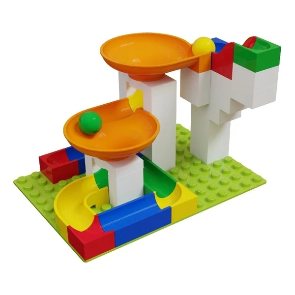 Le set contient 44 pièces de construction, y compris 1 plaque de base de 16 x 22,5 cm, 4 billes et deux rétrécissements.