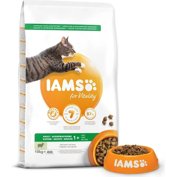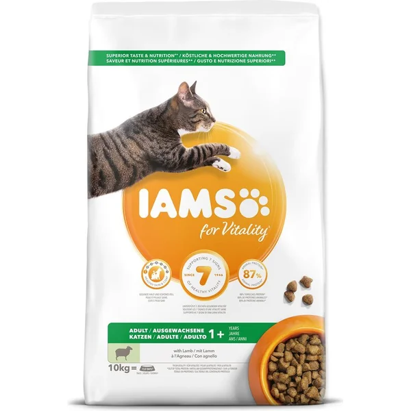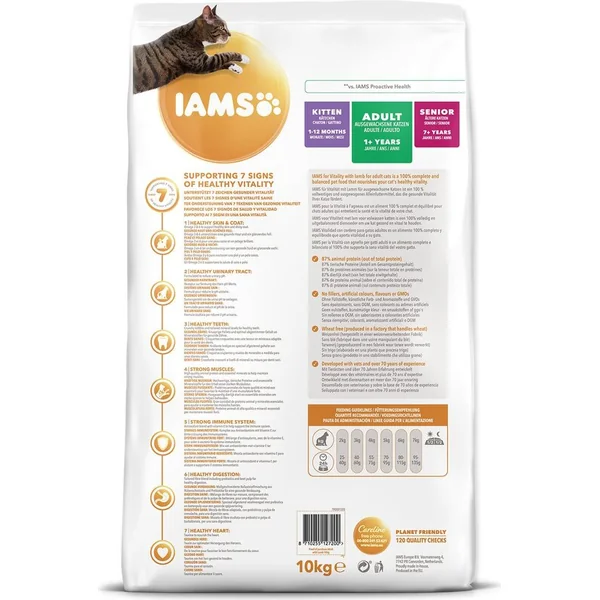Notre nouvelle formule améliorée pour chats adultes avec de la viande d’agneau est basée sur des protéines animales de haute qualité soigneusement sélectionnées pour soutenir sept signes de vitalité saine chez le chat. Pour que les chats soient en bonne santé, actifs et pleins d’énergie, nos délicieuses recettes contiennent jusqu’à 87 % de protéines animales (sur la teneur totale en protéines). Notre engagement est d’offrir aux chats une nourriture spécialisée au goût exceptionnel, que votre compagnon adorera sans réserve et qui soutiendra tous les sept signes de vitalité saine. Grâce à un équilibre d’acides gras oméga-3 et oméga-6 dans la nourriture IAMS, vous pourrez admirer la peau saine et le pelage brillant de votre animal. Nous avons développé nos recettes pour réduire le pH dans le système urinaire et le maintenir en bonne santé. Préparez-vous à voir votre animal sauter et s’ébattre. Cela grâce à des protéines de qualité et des minéraux essentiels qui aident à maintenir des muscles et des articulations sains. La combinaison d’antioxydants avec de la vitamine E renforce l’immunité, de sorte que votre animal ne sera jamais en danger lors de ses aventures. Et quand vous l’entendrez croquer nos croquettes avec un équilibre de minéraux dans chaque bouchée, vous pouvez être sûr qu’il aura des dents fortes et saines. En nettoyant la litière de votre chat, vous apprécierez une digestion saine grâce à une combinaison optimale de fibres, de prébiotiques et de pulpe de betterave. Nos aliments contiennent également sept nutriments essentiels pour un cœur sain, afin que votre compagnon ne cesse jamais de vous montrer son amour. La nourriture IAMS soutient sept signes de vitalité saine que vous serez heureux d’observer chez votre animal chaque jour. Instructions d’alimentation : voir le tableau sur l’emballage.