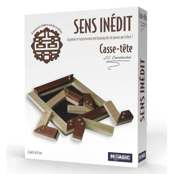 Comment faire rentrer 5 équerres dans une surface délimitée et imposée ? Le challenge paraît très simple mais se révèle être un redoutable défi. Chaque pièce est ajustée au dixième de millimètres et donne très vite l’illusion qu’il est impossible de faire rentrer les 5 équerres dans le cadre. En regardant ce casse-tête, on a l’impression qu’il n’est pas compliqué et on est loin de s’imaginer qu’il demande une redoutable perspicacité et une énorme patience pour arriver à trouver la solution.