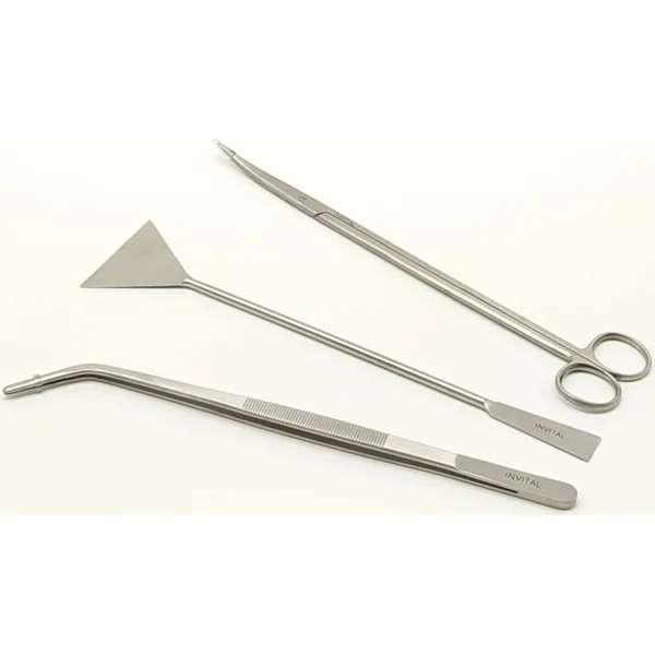 Ensemble de pincettes, ciseaux et râteau pour l’entretien d’un aquarium planté.
