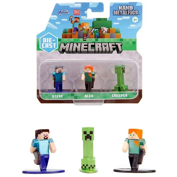 Figurines en métal de 4cm dans un blister de 3 pièces, représentant les personnages emblématiques de Minecraft (Steve, Alex & un Creeper).