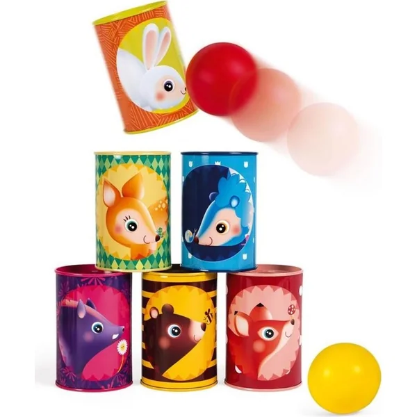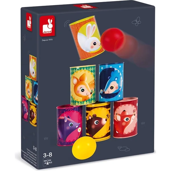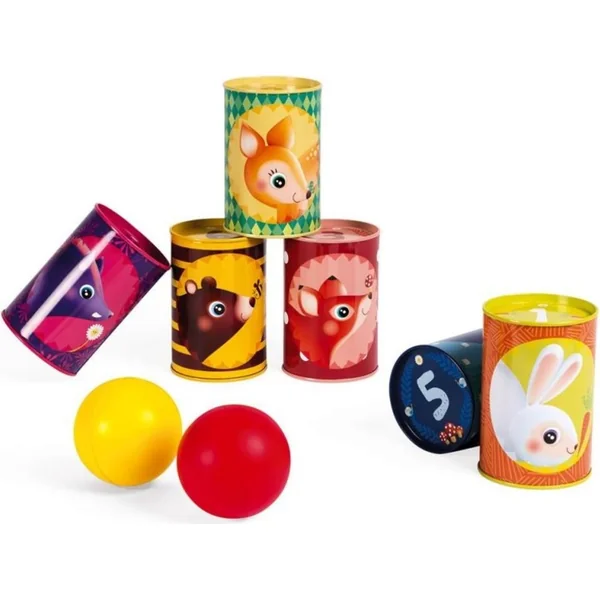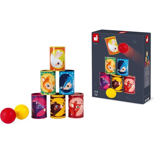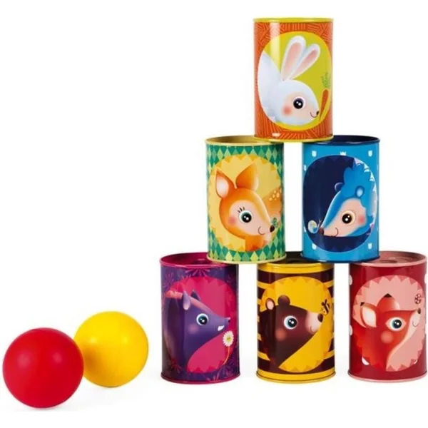 - Jeu de canettes avec des illustrations d’animaux forestiers, composé de 6 canettes en métal et de 2 balles en mousse : un ensemble à avoir pour une fête intérieure ou pour jouer dehors en famille !