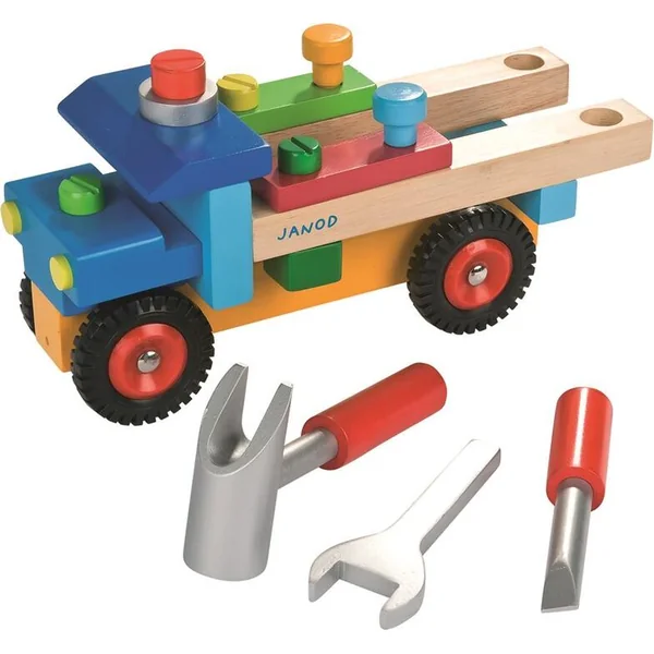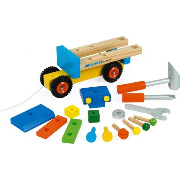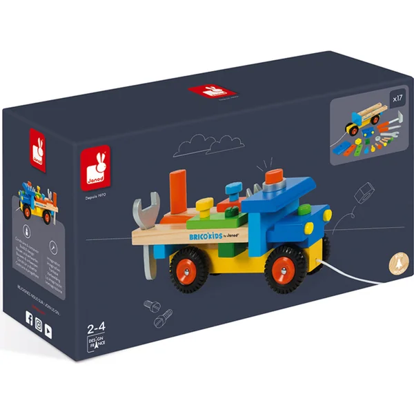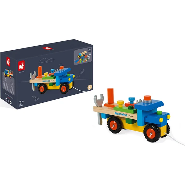 Janod Voiture en bois et construction pour garçons Camion BricoKids a une présentation colorée et se compose de 17 pièces.