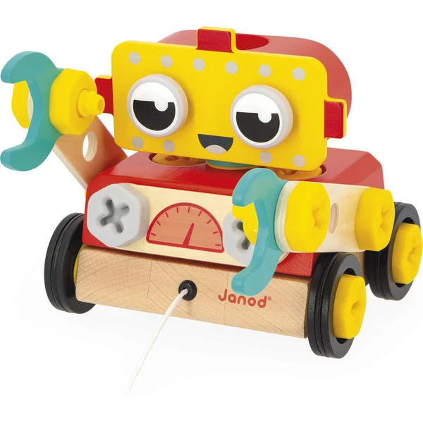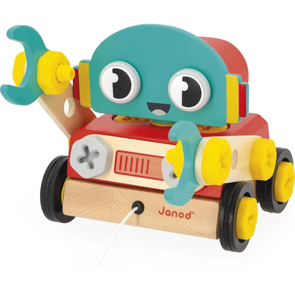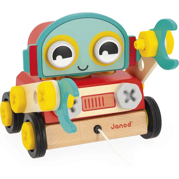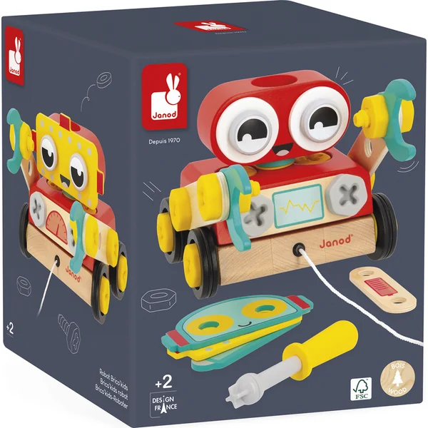 Nous vous présentons le dernier ajout à la gamme Brico’kids de Janod ! Un adorable petit robot en bois que vous pouvez assembler et emporter en promenade.