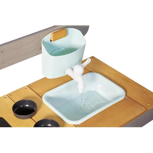 - Elle se compose de 2 éviers et de 2 pots en plastique amovibles : parfaits pour cueillir des fleurs ou ramasser de la terre ! Évier avec un vrai robinet : il suffit de le remplir et de tourner le robinet de droite à gauche pour que l’eau puisse couler !