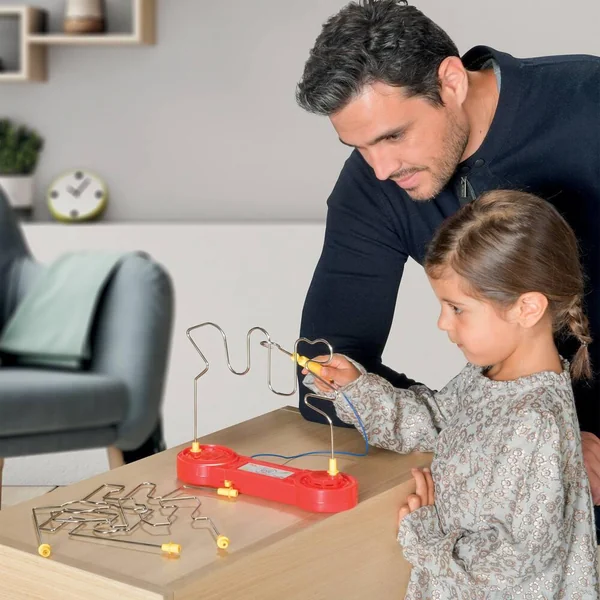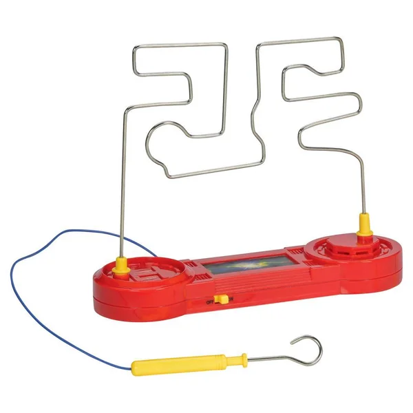 Pour 2 joueurs ou plus. Guide la baguette le long du parcours d’un côté à l’autre le plus rapidement possible. Prends garde à ne pas toucher le fil car tu feras sonner le buzzer ou alarme. 3 niveaux différents de difficulté. Contient : 1 base, 1 baguette et 3 modèles de labyrinthes interchangeables. Jeu de concentration, de patience et dextérité. 2 piles LR6 non fournies. Instructions incluses : imprimées sur la boîte.
