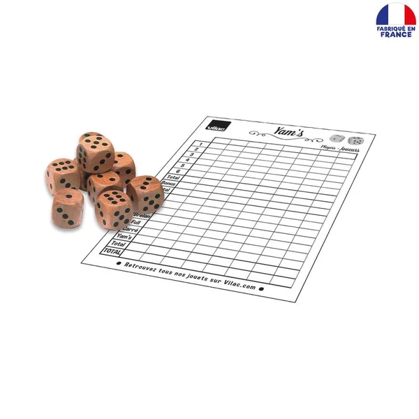 Jeu de Yam’s dont le but est de faire à la suite des combinaisons avec les cinq dés pour remporter le plus de points ! Ce coffret en bois contient cinq dés en bois, une feuille pour noter les points, un crayon et une règle du jeu en plusieurs langues. Fabrication française.