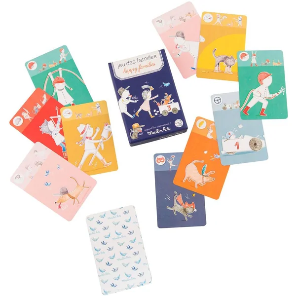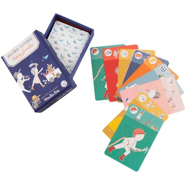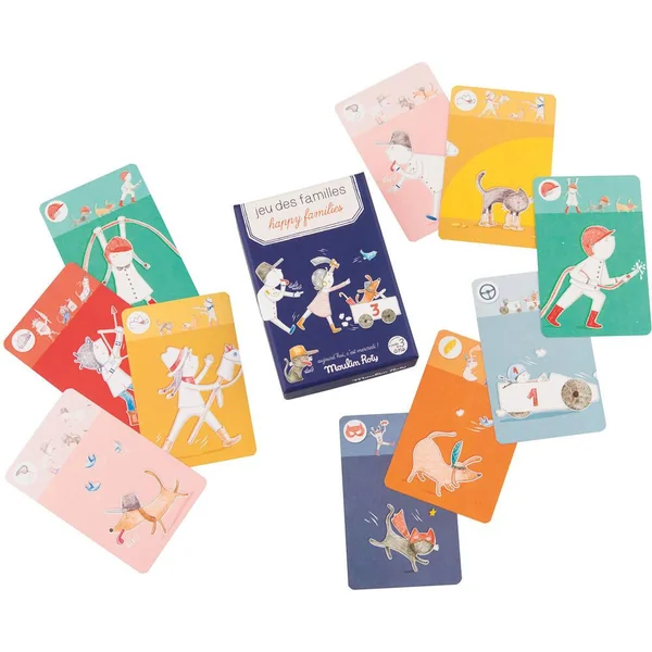 Jeu de cartes comprenant 9 familles de 4 personnages à recomposer : Lisette, Achille, Loulou le chien et Maou le chat, appartiennent tour à tour à la famille Pirate, Pompier, Super héro, Indien, Gendarme, Magicien, Pilote Cowboy ou Chevalier.