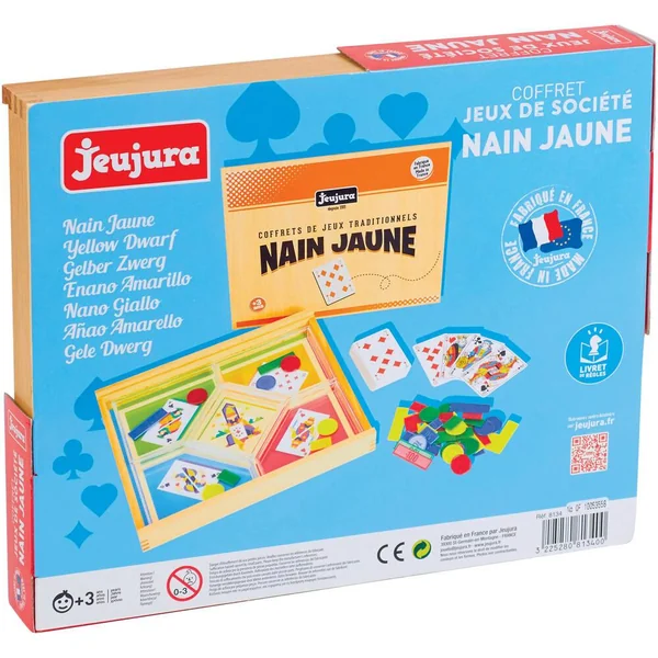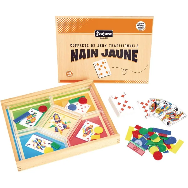 Jeu du nain jaune dans un coffret en bois comprenant 54 cartes, un sachet de jetons et une règle du jeu.
