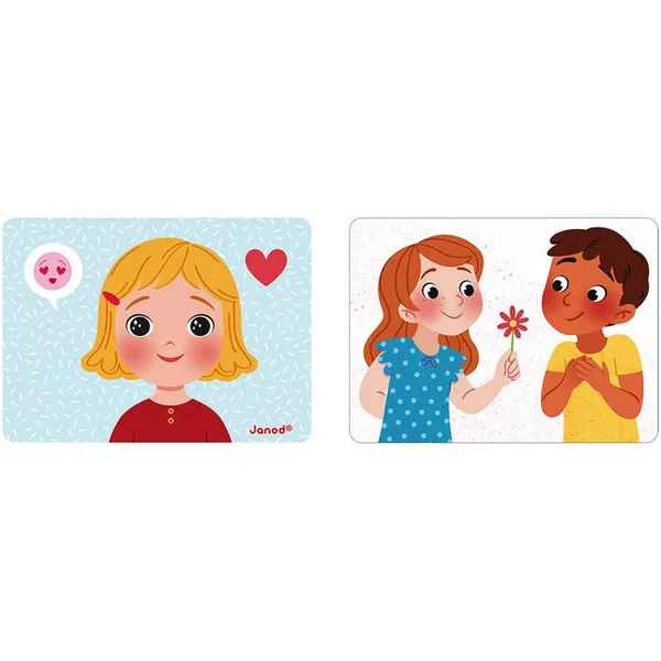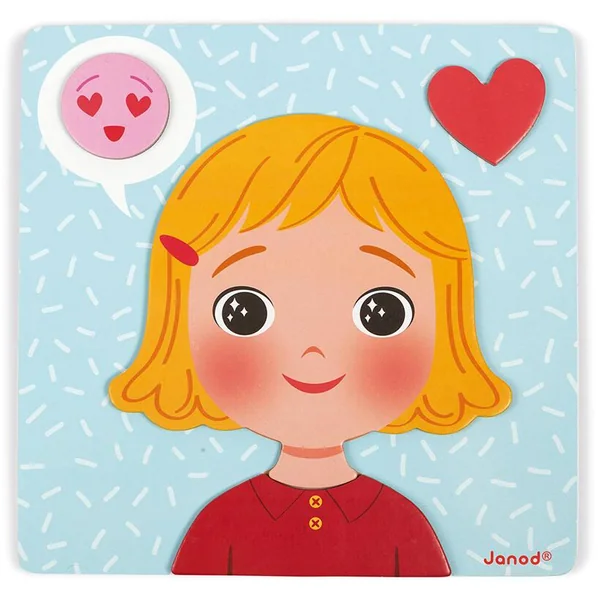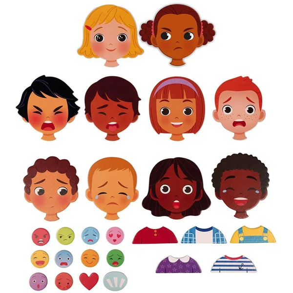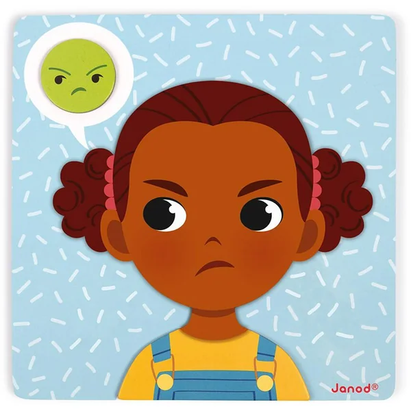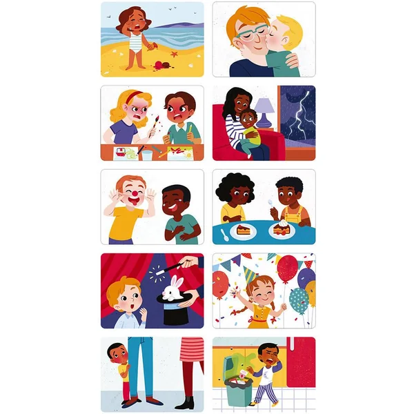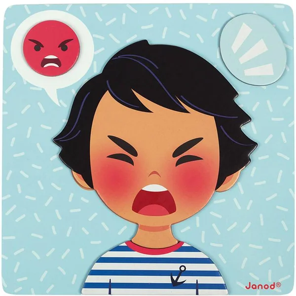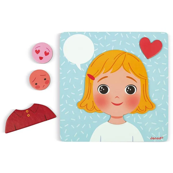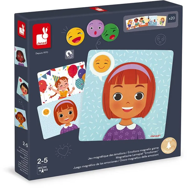 Contient 1 plateau en bois, 27 grands magnets et 20 cartes situation. Avec un guide des émotions rédigé par des psychomotriciens. Faites découvrir à votre enfant les émotions grâce aux cartes illustrées représentant différentes situations de la vie quotidienne. Au dos de chaque carte un visage réponse correspondant aux magnets à utiliser pour reproduire le visage correspondant à cette émotion. 2 niveaux de jeux : reproduire simplement l’expression au dos de la carte ou essayer de deviner à quelle émotion correspond chaque situation pour les plus grands. Il y a également un mirroir au fond de la boite pour que l’enfant s’entraine à reproduire et identifier les différentes émotions. 10 émotions à découvrir : joie, peur, tristesse, colère, gêne / timidité, amour, dégoût, rire, jalousie, surprise. Matière : carton.