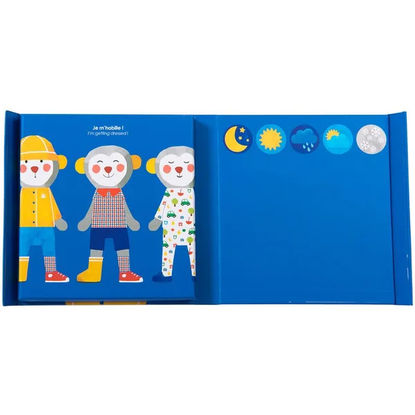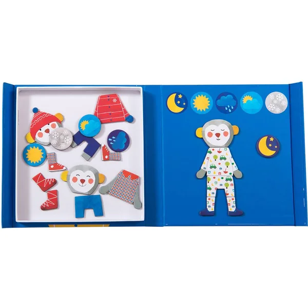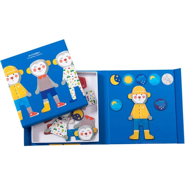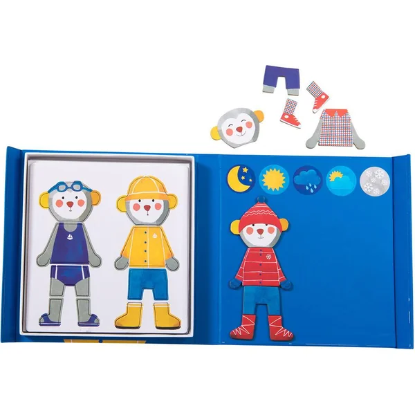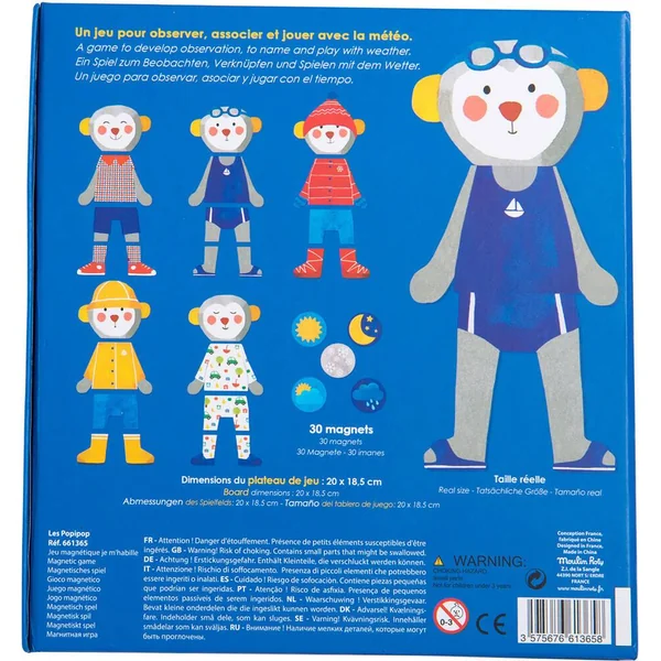 Jeu magnétique en carton pour habiller nos Popipop en fonction de la météo ! Magnets représentant différents vêtements et accessoires à poser sur les 3 planches magnétiques.