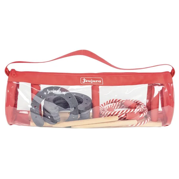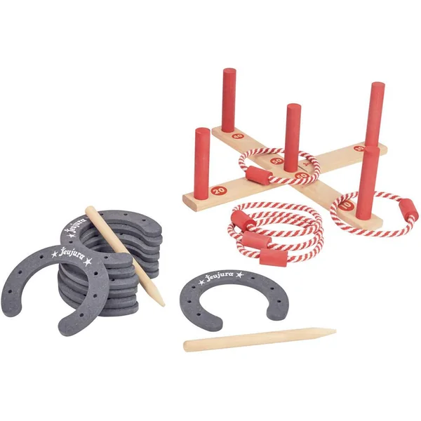 Jeux de Lancer en Bois, deux grands classiques de jeux de plein air un jeu des Anneaux : support en bois démontable avec 5 anneaux en cordelette avec poids en bois, un jeu de Fer à Cheval : 8 fers à cheval et 2 piquets dans un sac de rangement facile à transporter. Dimensions du sac : 48 cm – diam : 15 cm.
