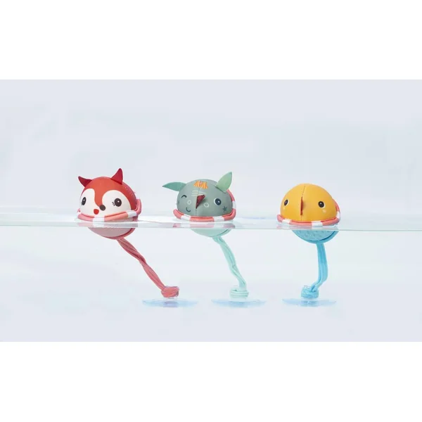 Les 3 balles de bain en néoprène se fixent avec des ventouses sur la paroi du bain et dansent sur l’eau, sous les yeux et à portée de bébé.