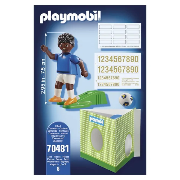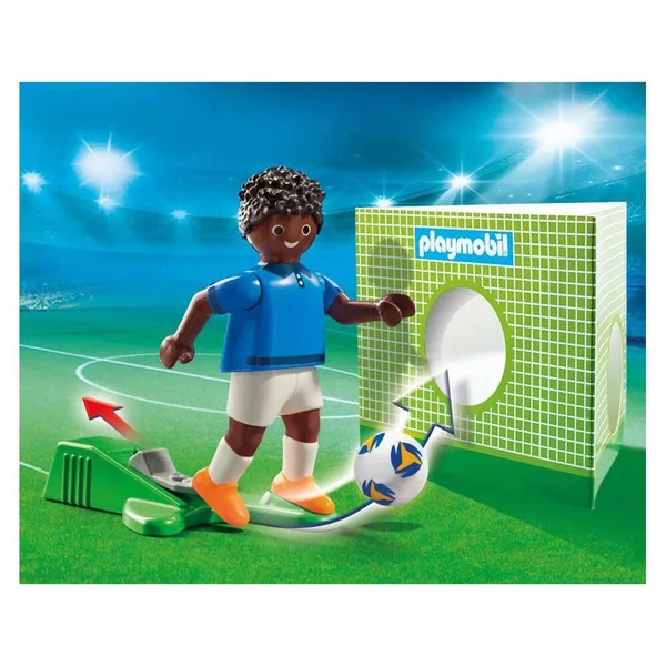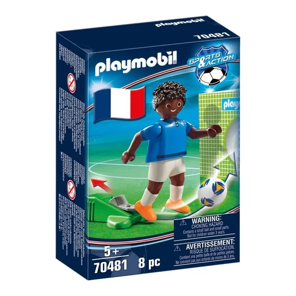 Joueur de football avec fonction de tir à une main, un ballon, une cage pour s’entraîner à marquer des buts et des numéros pour le maillot. Maillot avec l’emblème de l’équipe de France. Le joueur permet de compléter l’équipe du Grand terrain de football transportable.