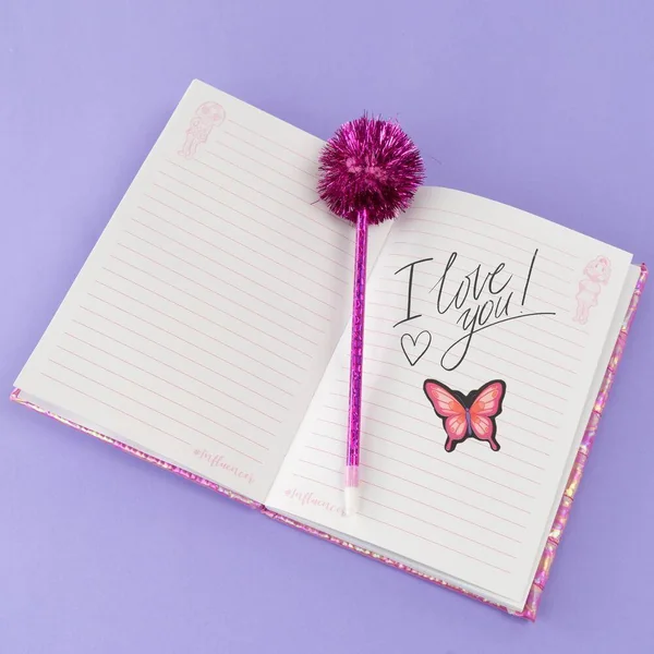 En plus du carnet, le set comprend une feuille de gemmes adhésives, des stickers et un joli crayon à pompon !