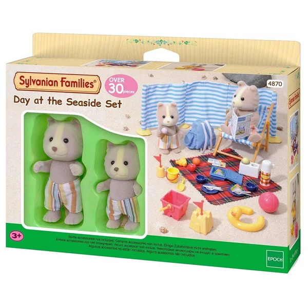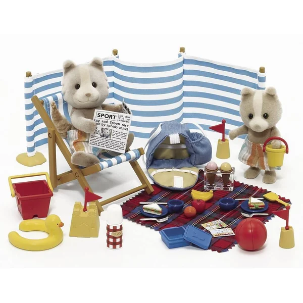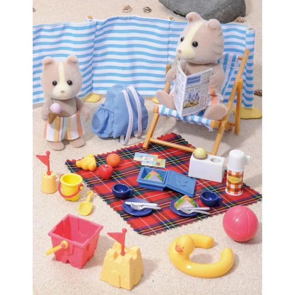 Ce set comprend :- 2 Figurines Papa Chien Marron et Garçon Chien Marron- Une chaise longue, 1 protège vent, 1 nappe à carreaux, 1 sac à dos, 1 petit seau, 1 grand seau, 1 pelle, 2 petits drapeaux, 1 bouée canard, 1 ballon, 1 thermos, 1 tasse, 2 glaces et leur support, 2 assiettes, 2 verres, 2 fourchettes, 2 couteaux, 1 régime de 3 bananes, 1 pomme, 1 orange, 2 sandwiches et leur boîte de conservation, 1 journal et des cartes postales.