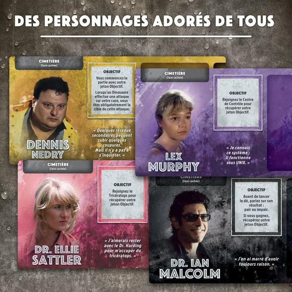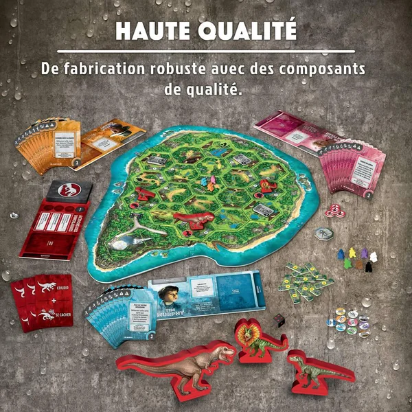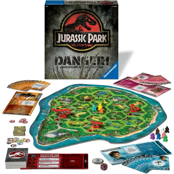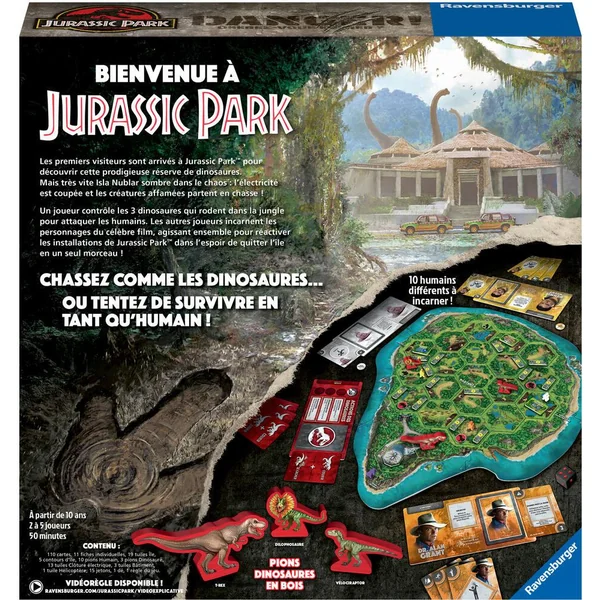 BIENVENUE À JURASSIC PARK™ ! Les premiers visiteurs sont arrivés à Jurassic Park™ pour découvrir cette prodigieuse réserve de dinosaures. Mais très vite Isla Nublar sombre dans le chaos : l’électricité est coupée et les créatures affamées partent en chasse ! Un joueur contrôle les 3 dinosaures qui rodent dans la jungle pour attaquer les humains. Les autres joueurs incarnent les personnages du célèbre film, agissant ensemble pour réactiver les installations de Jurassic Park™ dans l’espoir de quitter l’île en un seul morceau ! Chassez comme les dinosaures… ou tentez de survivre en tant qu’humain !