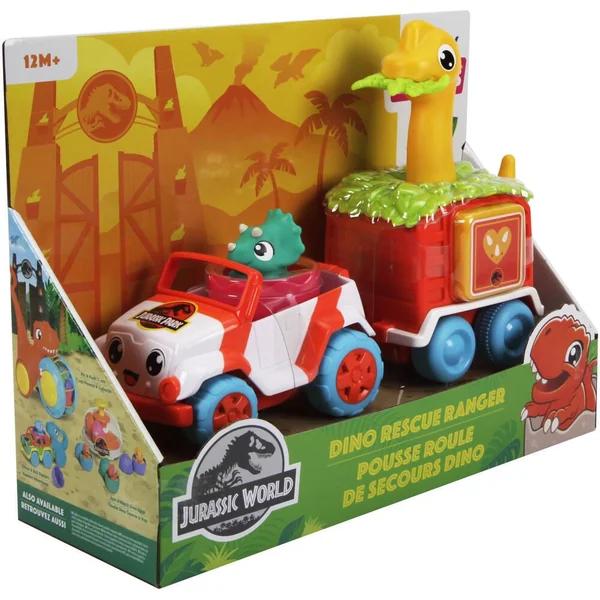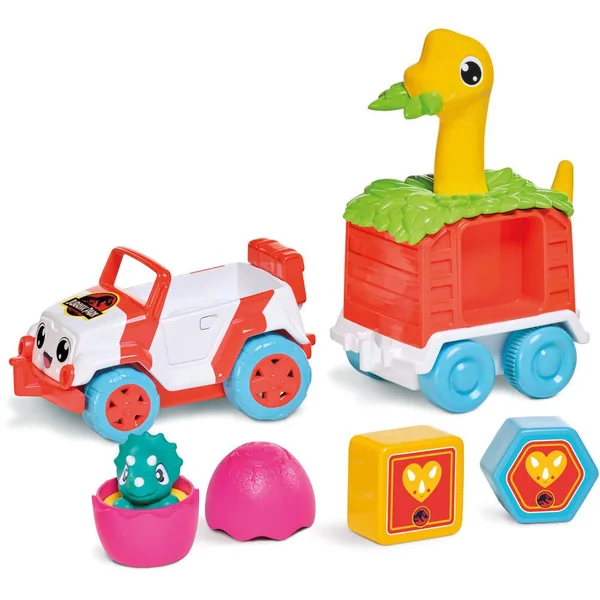 Un véhicule pousse roule 2 en 1 qui comprend une mini jeep avec un bébé dino et un chariot trieur de forme. Lorsque Bébé appuie sur la tête du dino, il verra le véhicule partir à toute vitesse, lui faisant ainsi découvrir la relation de cause à effet. Bébé s’amusera également à replacer les formes sur le chariot.
